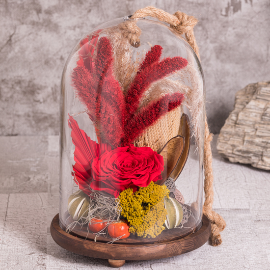 Kapalı cam fanus içerisinde kırmızı solmayan gül, kurutulmuş çiçekler ve diğer aksesuarlar ile tamamlanmış tasarımın ortaya çıkardığı mükemmel çalışma... Kalbimin içi.