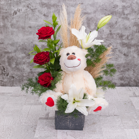 Şirin mi şirin bir maskot, güller ve lilyumları başak dalları ile harika bir tasarıma çevirdik. Çok hoş görünüyor değil mi? Eminiz ki, bu harika çiçeği karşısında gören kişi de çok mutlu olacak. O özel insana harika bir tebessüm hediye etmek isterseniz, özel tasarımımız "Aşk Meselem" sizin için daima hazır.