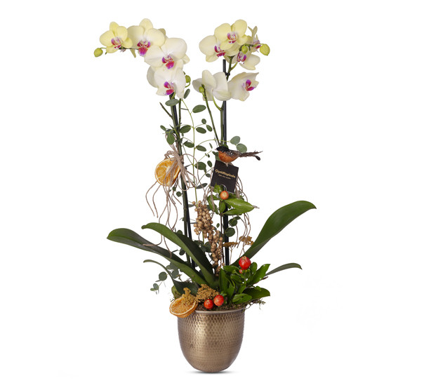 Bakır Saksı İçerisinde 2 Dallı Penolopsis Orkide ve Doğal Aksesuarlar Kullanılarak hazırlanmıştır.