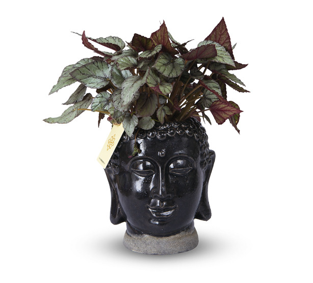 Buda heykeli içerisinde rex begonia saksı bitkisi