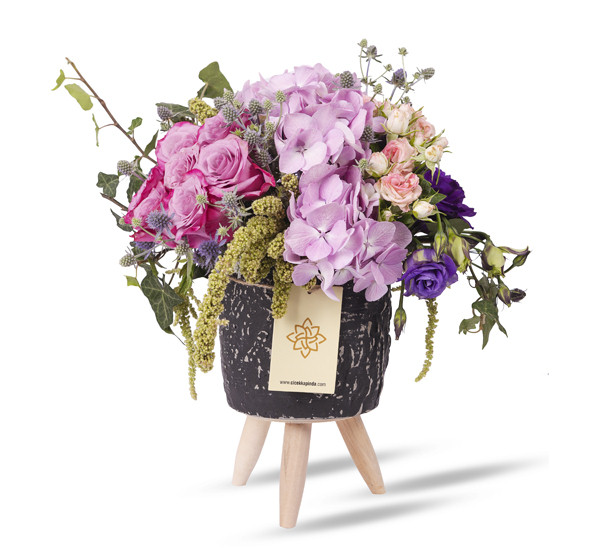 3 ayaklı saksıda ortanca, lisyantüs ,çardak gül ve muthelif aksesuarlar ile sunumu.