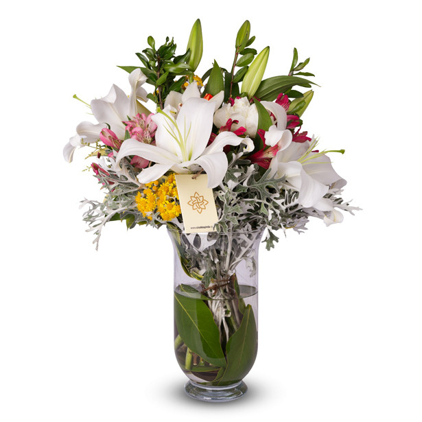 Lilyumlar, Astomerialar, sarı papatyalar ve aksesuar yeşillikler... Cam vazoda harika durdular.