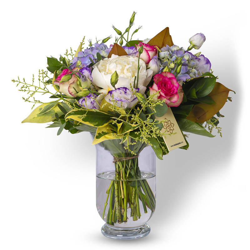 Şakayıklar, ortancalar, lisyantüsler ve güller... Aksesuar yeşilliklerle birlikte cam vazoda mükemmel uyum.