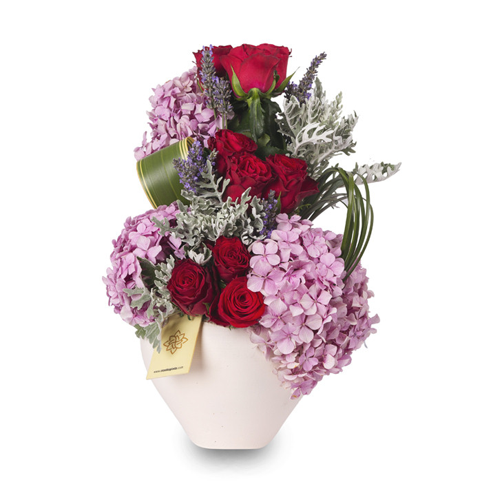 Seramikte ortancalar, güller, lavantalar ve dekoratif yeşillikler ile mükemmel bir tasarım