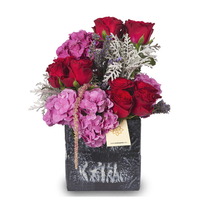Ortanca, güller ve aksesuar yeşillikler ile kare seramikte harika tasarım.