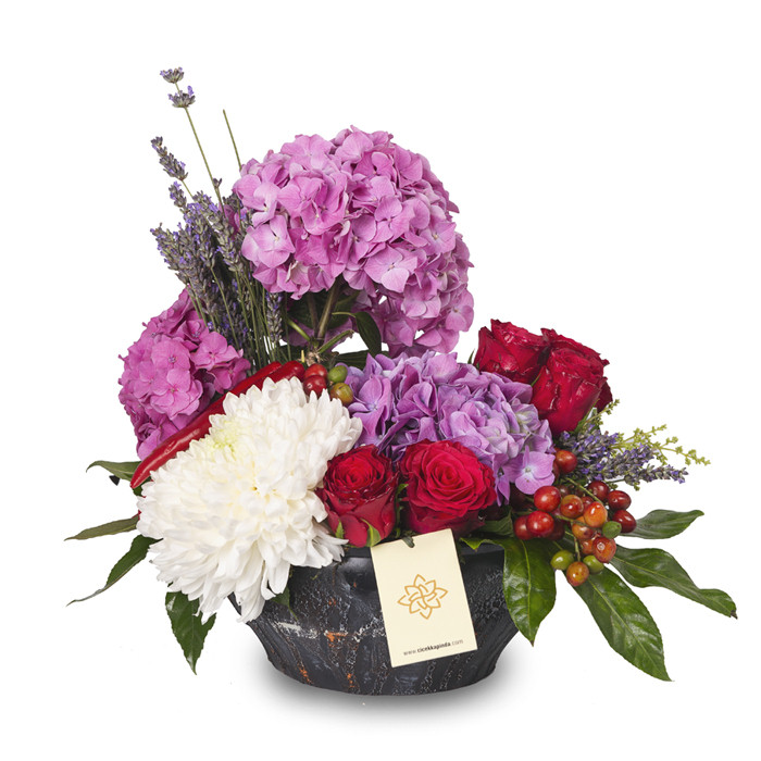 Ortancalar, kırmızı güller, Anastasya, Süs biberleri ve aksesuar yeşillikler ile seramikte mükemmel tasarım.