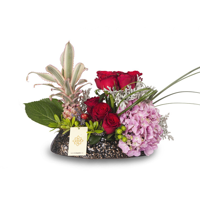 Kaya seramikte güller, ortancalar, Ananas ve aksesuar yeşillikler ile harika tasarım.