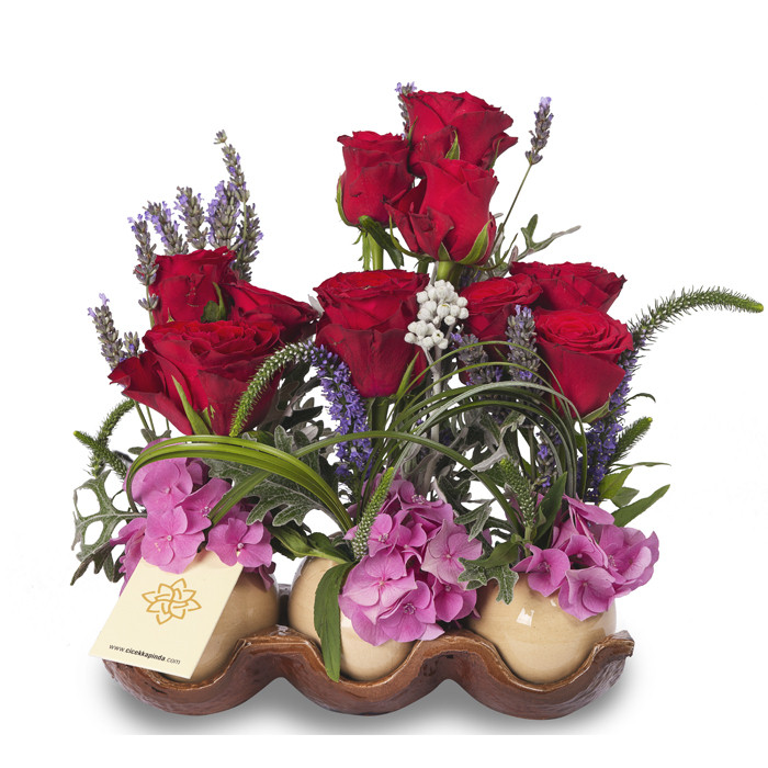 Yumurta seramikte Kırmızı güller, pembe ortancalar, lavantalar ile hazırlanmış tasarım