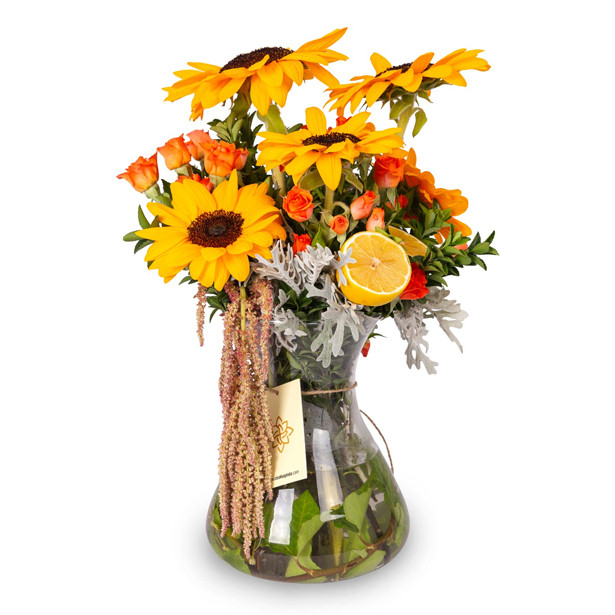 Turuncu çardak güller, günebakan, limon ve gümüş bitkisi ile hazırlanan harika tasarım.