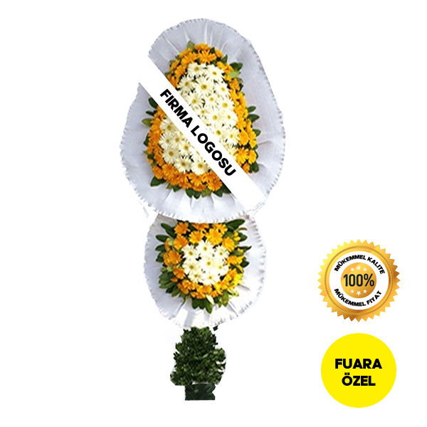 Sarı ve beyaz gerberalardan çift katlı çelenk. Sevdiklerinizi fuarda yalnız bırakmayacak, onların heyecanına ortak olduğunuzu gösterebileceğiniz, üstünde firma logonuz veya adınızın yazılabileceği çift katlı çelengimiz, tüyap fuarı için seçilebilecek en güzel çiçeklerden.