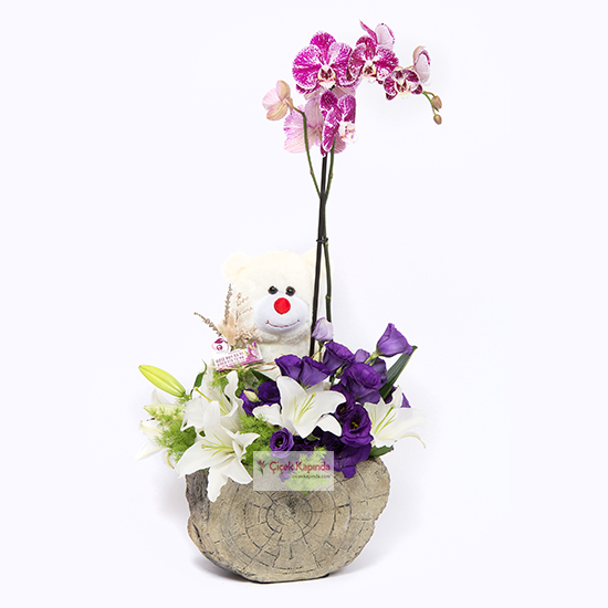 Taş Vazoda Özel Tek Dallı Orkide, 6 Kandil Lilyum, Mor Lisyantuslar, 1 Adet Peluş Ayıcık, Doğal Yosun ve Aksesuarlar Kullanılarak Hazırlanmıştır